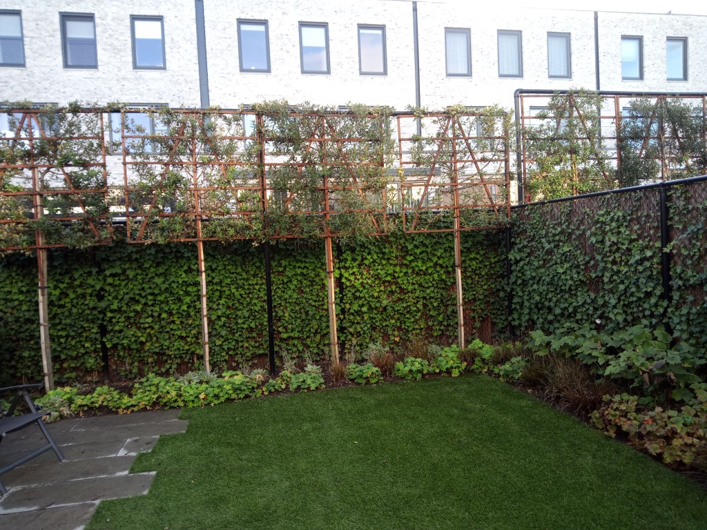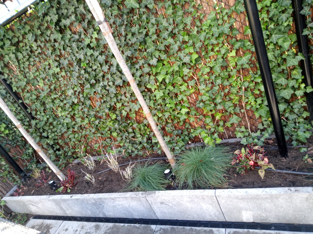 Om de gevel mooi te bekleden is er gekozen voor Toscaanse Jasmijn. Deze is groenblijvend in de winter (ook wel winterhard genoemd) en vanaf mei bloeien er mooie witte bloemetjes in die ruiken naar vanille… Kunt u zich die heerlijke geur in de tuin al voorstellen?